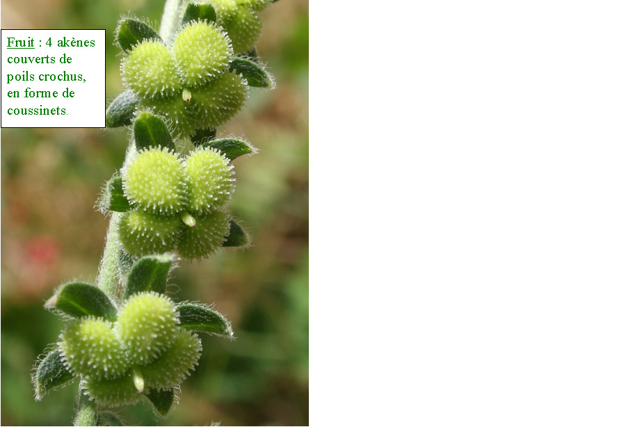4 akènes globuleux couverts de poils crochus, formant comme un petit coussin.