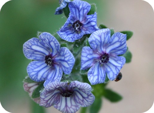 formées de 5 lobes arrondis bleu pâle, veinés de violet en réseaux.